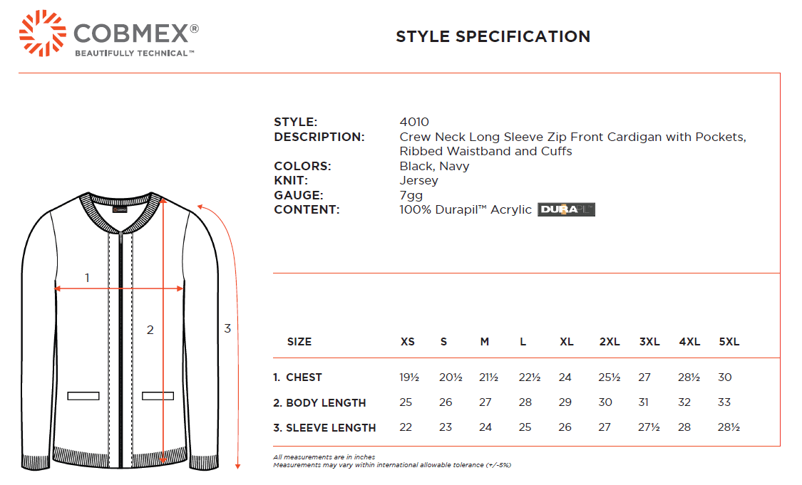 The Cobmex 4010 is a crew neck, long sleeve zip-front cardigan featuring convenient pockets and ribbed waistband and cuffs. Crafted from 100% Durapil™ acrylic, it offers superior durability and pill-control. Available in sizes XS to 5XL and colors black and navy, this cardigan combines functionality with a professional appearance.