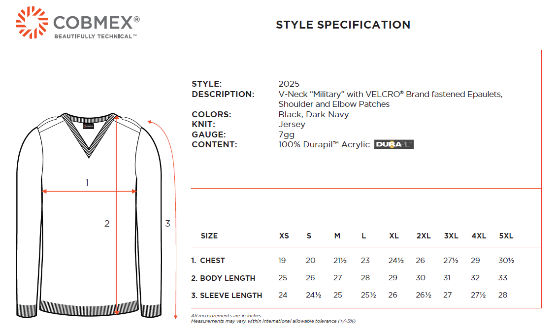 The Cobmex Unisex V-Neck "Military" with VELCRO Epaulets, Shoulder & Elbow Patches is designed for durability and performance, crafted from 100% Durapil™ Acrylic for long-lasting wear. Ribbed cuffs and a waistband ensure a comfortable fit throughout the day. Combining functionality with a polished look, it maintains a professional appearance in any setting. A trusted choice among law enforcement, EMTs, and fire services, this sweater delivers reliability and style for demanding professions.