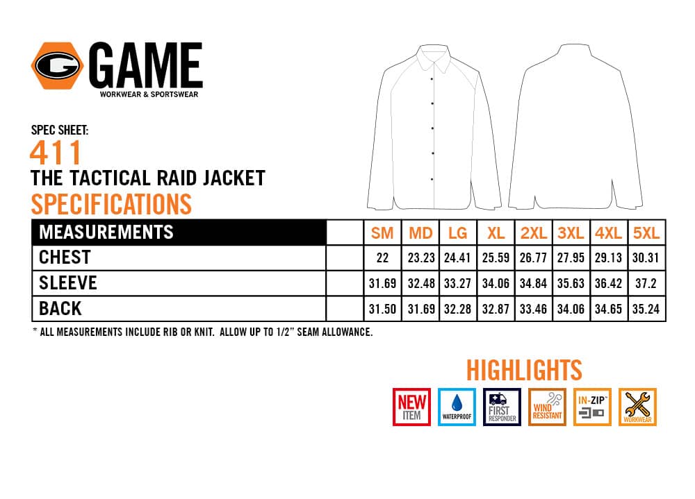 The Game Tactical Raid Jacket offers superior waterproof protection and functional versatility for law enforcement and tactical operators. Constructed from 150-denier 100% TPU polyester oxford ripstop with sealed seams, itUs built to block wind and moisture in any condition. The raglan sleeve design enhances mobility, while side seam zippers provide comfortable access to duty belts and gear. With sealed front slash pockets, two hidden inner tactical pockets, and adjustable wrist closures, this jacket balances practicality with professional appearance. The Back In-Zip system allows quick access for customization or identification panel placement.